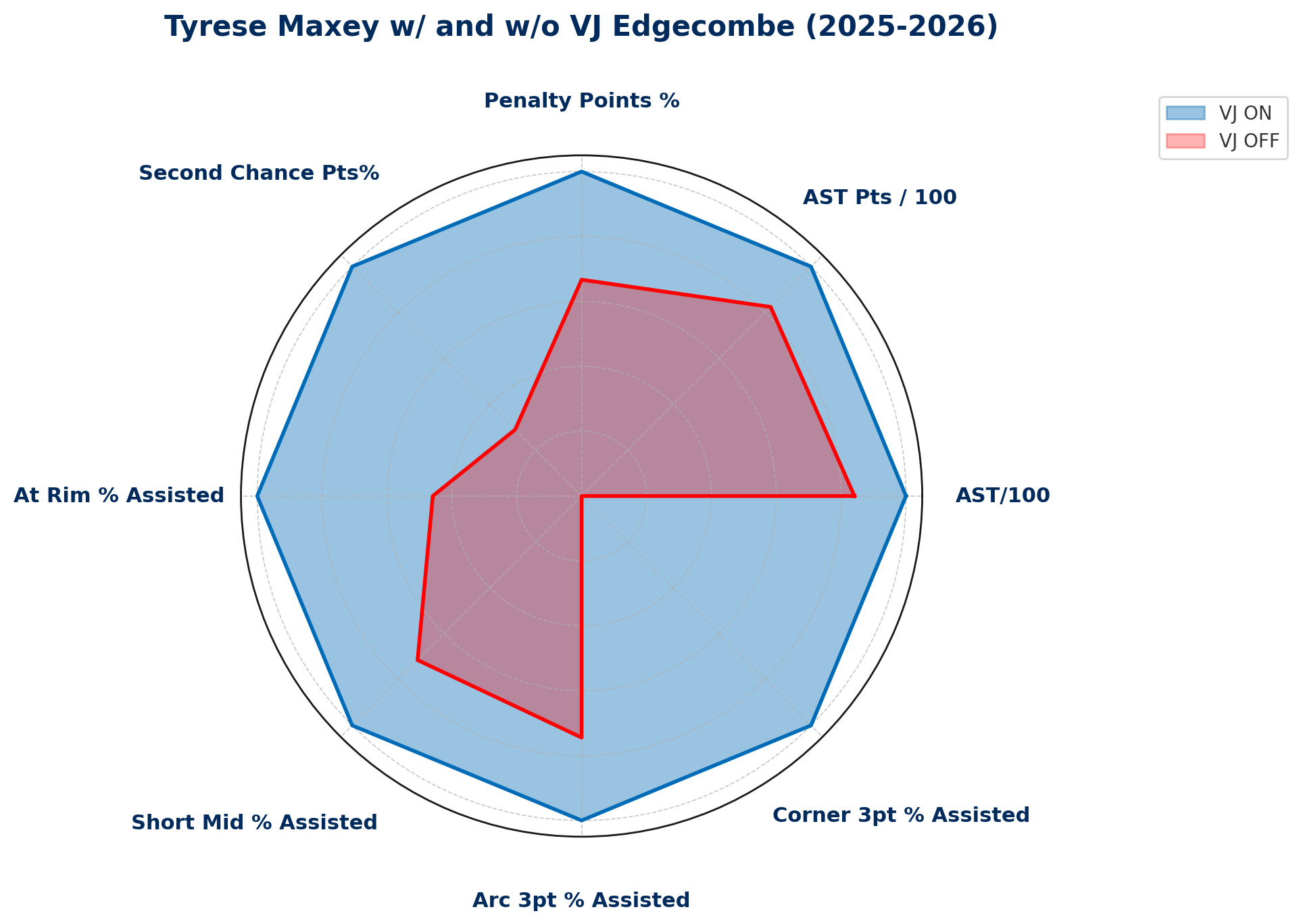 We can infer from this that when Edgecombe is on the floor, Maxey doesn’t just score more; he becomes a better playmaker and decision-maker. Edgecombe and his spacing, movement, and connective play amplify the Sixers’ centerpiece.